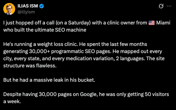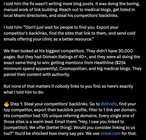 And then I saw a tweet from an SEO I really respect talking about the exact same concept. A client with 30,000 programmatic pages getting no results because their domain rating was too low. His takeaway? The best way to get backlinks is to take your competitors’ backlinks.
