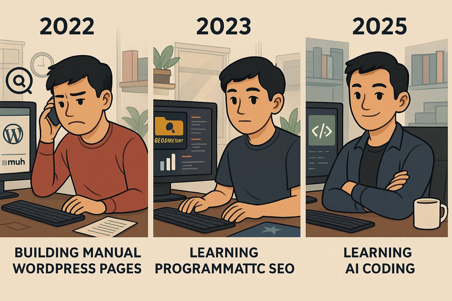 In 2023-2024, I evolved from manually creating Wordpress pages when I started learning about programmatic SEO (this is when I discovered Geodirectory in Wordpress). I now understood how SEO worked, but was severely limited by Wordpress plugins.